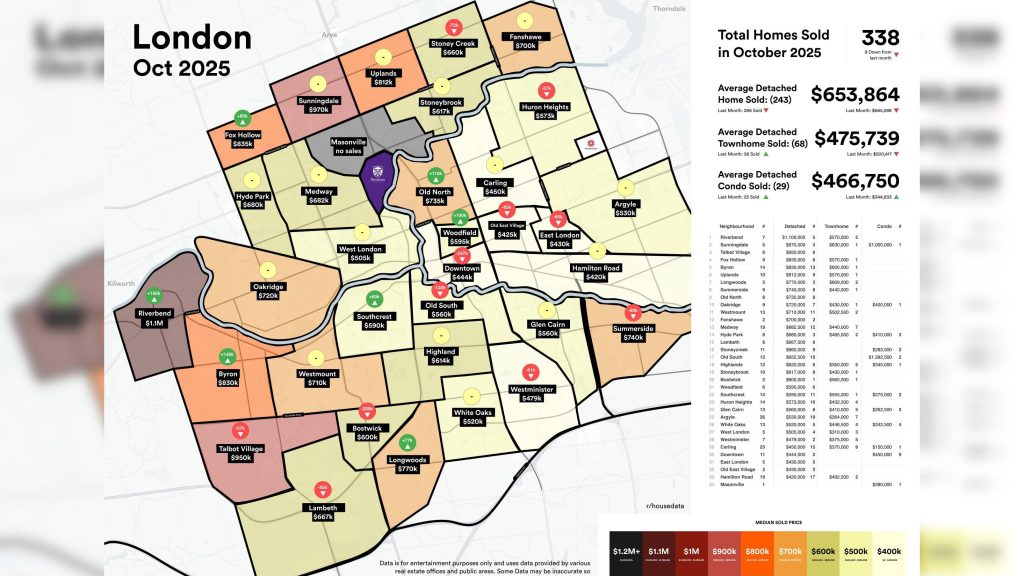 According to recent analysis of October sales data, detached homes in London averaged $653,864 based on 243 sales, while townhomes came in at $475,739 across 68 transactions. Condominiums averaged $466,750 with 29 sales recorded for the month.